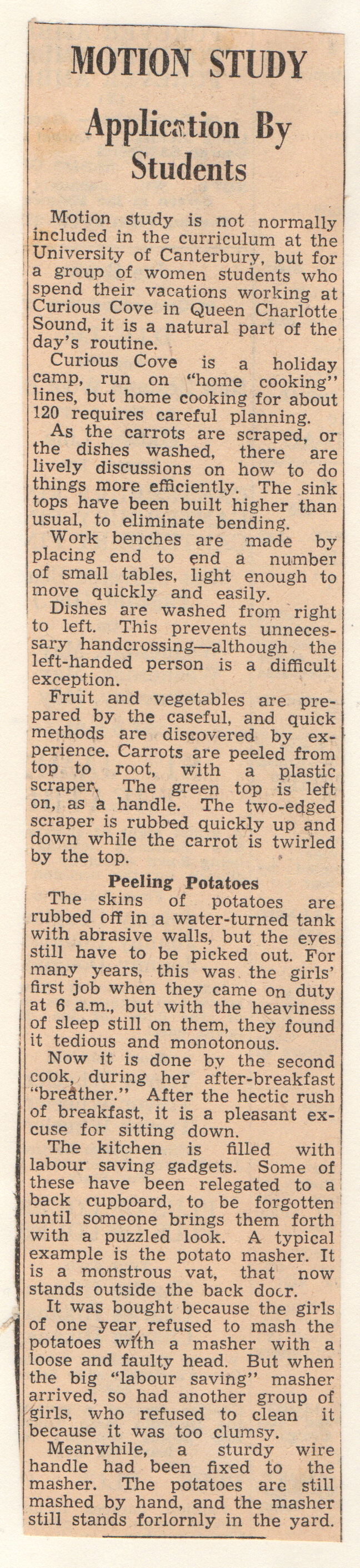 Almost everything was made from scratch. The 1950 movie Cheaper by the Dozen, the story of time and motion study experts Frank and Lillian Gilbreth and their twelve children, was as big a hit in New Zealand as it was in the U.S. Following the Gilbreths’ methods, the Curious Cove kitchen crew, being university students, amused ourselves by figuring out more efficient ways to do things.