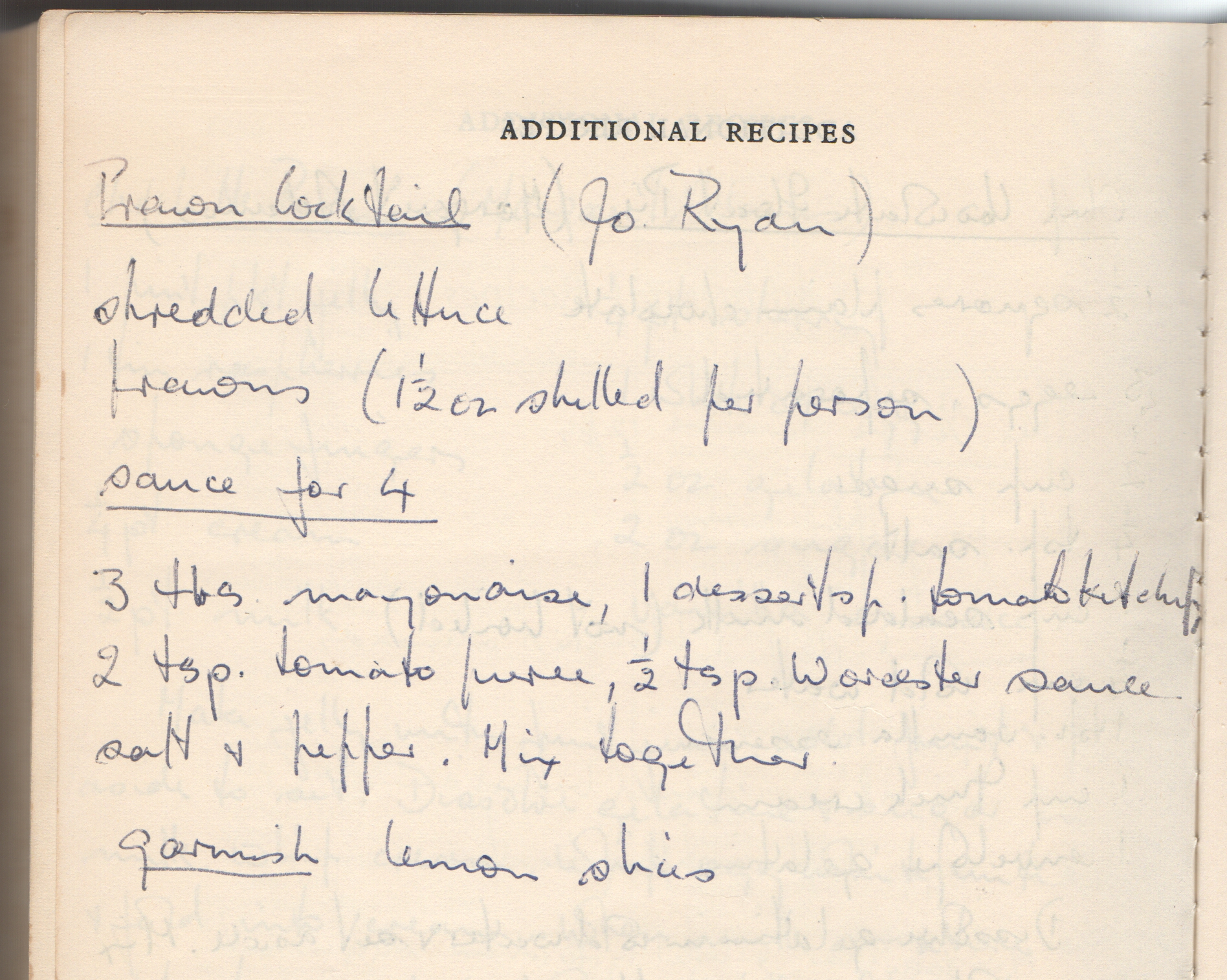 On the back pages of my English cookbook are two recipes, one for a Charlotte Russe from Margaret and a prawn cocktail from Jo, both classic 1960s recipes. I remember the occasion vividly. My husband Tony had accepted a position in California. We were waiting for our US green cards to come through –a nerve-wracking saga that I’ll write about sometime. Meanwhile, his prospective new boss was passing through on his way home to Denmark for Easter, and wanted to meet Tony. A dinner invitation was obviously required. But what to serve? In a panic, I turned to my sister-neighbors. They held my hand and helped me through planning a menu. Prawn cocktail to start, and Charlotte Russe for dessert. For the main course I probably served roast lamb, a traditional New Zealand staple.